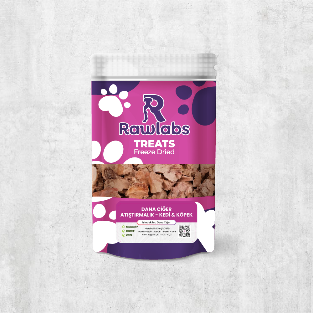 Açıklama: Dana ciğer; yavru, yetişkin kedi ve köpekler için uygundur. Seyahat, yürüyüş, egzersiz ve eğitim için kolay kullanıma sahiptir. A ve B vitaminleri deposu olan dana ciğer, vitamin A yönünden çok zengin olduğu için günlük tüketilmesi gereken miktar sınırlıdır. Sindirimi kolaydır. Katkı maddesi içermeyen mamalarımız %100 Doğal üretilir.